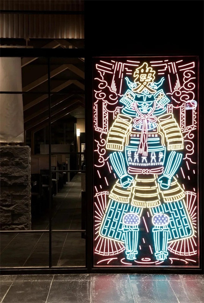 店門口的霓虹燈武士像和墻上掛著的“愛”字標識都突顯日本武士道精神。