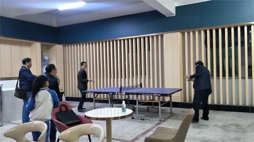 4.參觀指導之余葉教授和王院長等一行領導看到辦公區大廳旁的乒乓球臺時,便禁不住一時興起想活動一下,兩人便揮拍對練起來,球藝精彩叫好,同時贊成這種將運動設備擺進辦公區的方式很好,即可學習運動員的頑強拼搏精神,也可強身健體為實現宏偉的計劃目標提供強壯的身體保障,同時吸引更多的優秀人才加入海德利共同發展創造奇跡。
