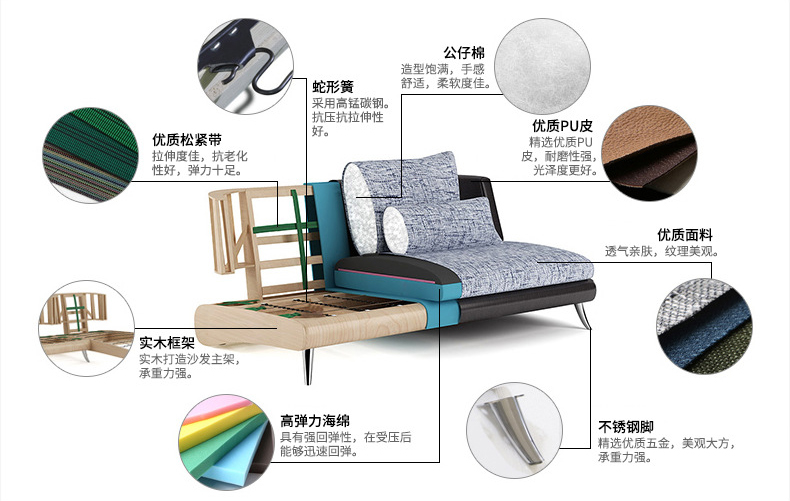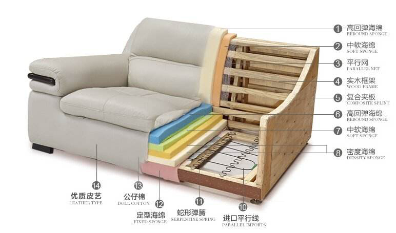 沙發的坐墊有兩種類型,一種是彈簧包,一種是全海綿。低端沙發還有用蛇形豎彈簧和發泡橡膠、公仔海綿的,這種變形不耐久、橡膠硬化不舒服,基本只有3~5年壽命。中高端產品用更牢固的高彈性繃帶和不易變形的S形橫向彈簧,填充物主要有高回彈記憶海綿坐墊應選擇36-50公斤/立方米以上的高彈泡沫海綿,背墊應使用密度25-35公斤/立方米以上的高彈泡沫海綿,不易變形。