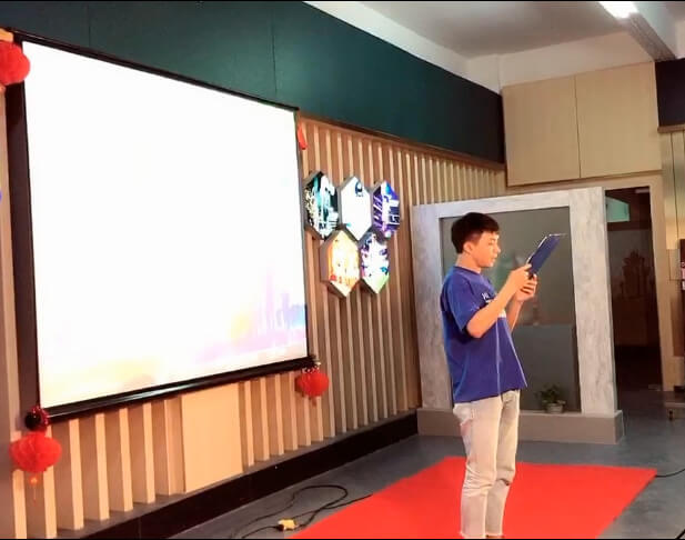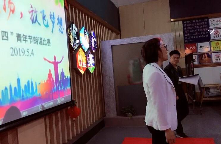 2019年54。19:00一切準備就緒,精彩的朗讀比賽在歡快激昂的音樂聲中開幕了!一段運動進行曲,把全場的氣氛瞬間活躍了起來。選手們個個摩拳擦掌,躍躍欲試。主持人開場后由公司最高層領導致辭,并宣布比賽開始。并進入第一個環節。23組選手紛紛抽簽按順序準備上臺表演。第一位出場的朗讀者是谷樹平演講內容積極向上聲音洪亮、娓娓動聽引人入勝,拉開了朗讀賽的序幕。伴隨著陣陣的掌聲的起落,很快輪到了五號選手。譚冰冰上臺演講了,只聞一段振奮人心的背景音樂一響起便把朗讀演講的氣勢上了較高的一個層次,同時配上抑揚頓挫高亢激昂的演講聲贏得了評委及觀眾的陣陣掌聲。接下來的六號選手朱運強以及十號選手梁偉海,同樣用振振有詞激奮人心的演講打動了評委和觀眾,讓高潮迭起,一浪高一浪同樣贏得了現場評委和觀眾的陣陣掌聲。最后在23號雙人選手,吳素漫和鄧紹云的中英雙語完美結合的朗讀聲中結束了。