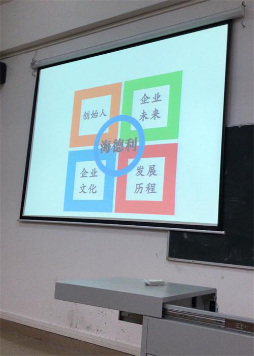 輪到海德利谷細堂總經理上臺分享的時間。谷先生用PPT通過投影儀向師生展示海德利風貌。整個演講內容包括“創始人介紹”、“海德利發展歷程”、“海德利企業文化”和“海德利的未來”。