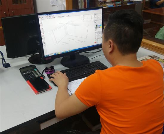 在海德利家具廠,每一件產品先由設計部門的設計師先對家具的比例和結構深入思考和解構,設計師對家具用腦子“吃透”以后,就著手深化家具的生產工藝圖。家具的生產工藝圖,不只是簡單的畫圖,而是一套工藝思維,包括家具效果圖、家具三維圖、家具三視圖和家具的局部細節圖。