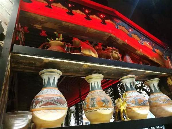 在陶瓷上畫(huà)著精美的畫(huà),向我們展示了一個(gè)民族的文化以及日常生活情景。在裝飾物上面,我們可以看到古風(fēng)的吊燈以及別致的墻面隔斷,整個(gè)主題餐廳設(shè)計(jì)打造成了一個(gè)古樸溫馨的氛圍。光投在這些裝飾品上,反射者柔和的亮,高高低低交錯(cuò)著。