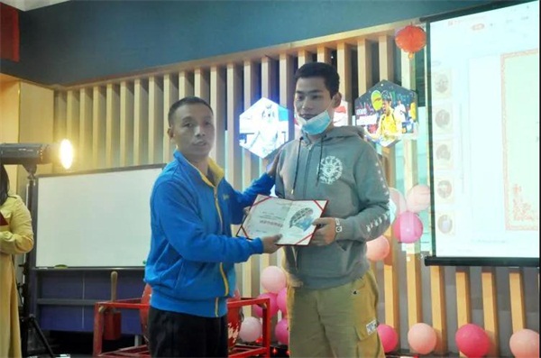 圖為快樂會議現場,公司負責人為積分表現優秀的員工頒發榮譽證書