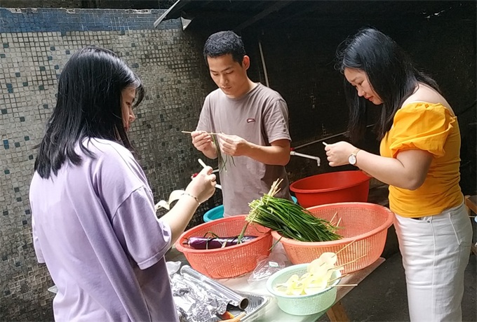 接到任務,我開始馬不停蹄的策劃及部署,聯系推廣部準備投影儀及制作創意背景,利用美團跑腿購買蔬菜及燒烤配料,考慮到我們不是專業燒烤師,不擅長烤肉類食物,便向谷先生請示去燒烤店烤肉類,我們自己烤素食,谷先生非常贊成!廚房師傅給我們提供了燒烤工具,我們小伙伴就開始一起洗菜、串菜,做的有模有樣!在串菜的同時,姜小姐也來到了我們公司。