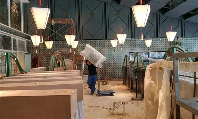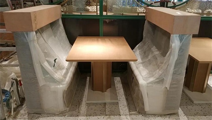 可是,一看到新餐廳四周的餐廳家具都是由我們海德利提供,干勁就又上來了。第二天上午8:00,我們又派來了另外4位師傅到餐廳安裝桌子,擺放椅子和卡座。