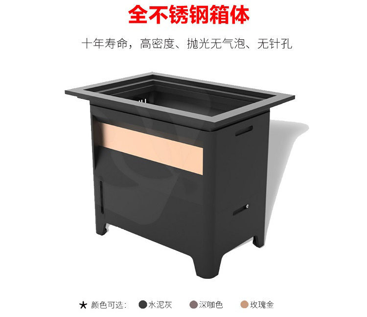 可定制范圍:智能化觸屏板、配套火鍋電磁爐、油煙凈化裝置、抽風(fēng)組件、全不銹鋼箱體、USB充電插座、配套鍋型和鍋圈、火鍋臺面、框架、無線充電等等。