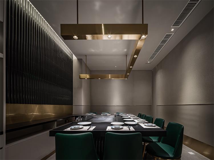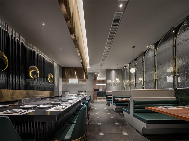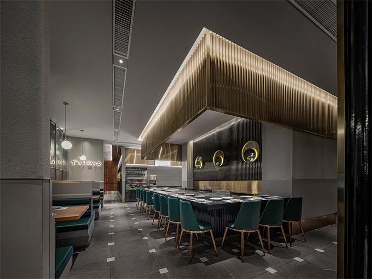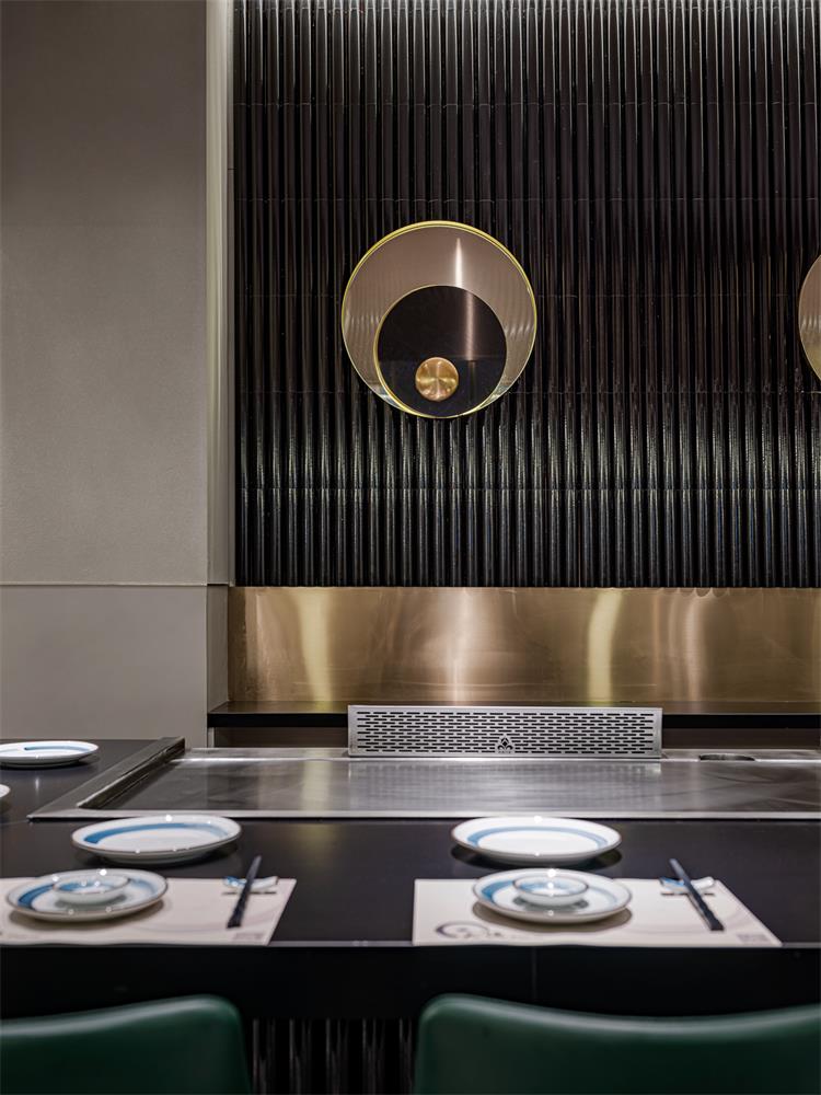 深入大漁內部也就進入了味蕾的“海洋中心”。駕馭帆船在大海里乘風破浪,拋出垂釣大魚的燈籠,漁獲多多滿載而歸后,旋即來到鐵板上開始舌尖上的新探險。大漁的空間設計十分簡約,黑、灰、金3個主色配比,既有碰撞又相互調和。落日金不銹鋼和質感黑瓷一張一弛,在氛圍燈的渲染下,表現出不同區(qū)域海浪的層次感,烘托出精致輕奢的餐飲氛圍。