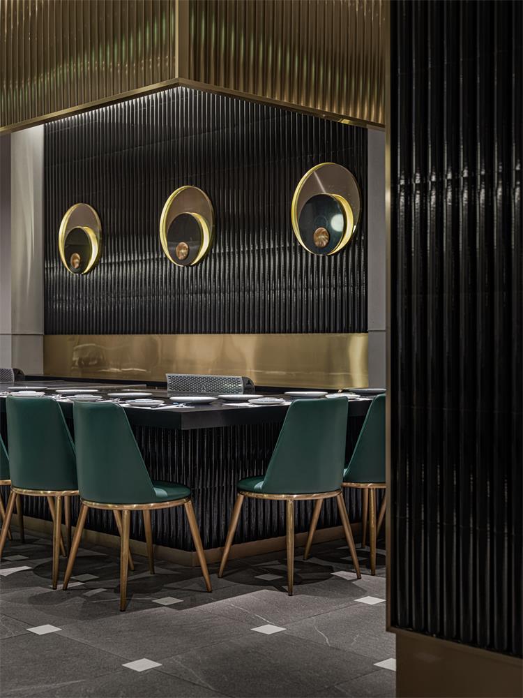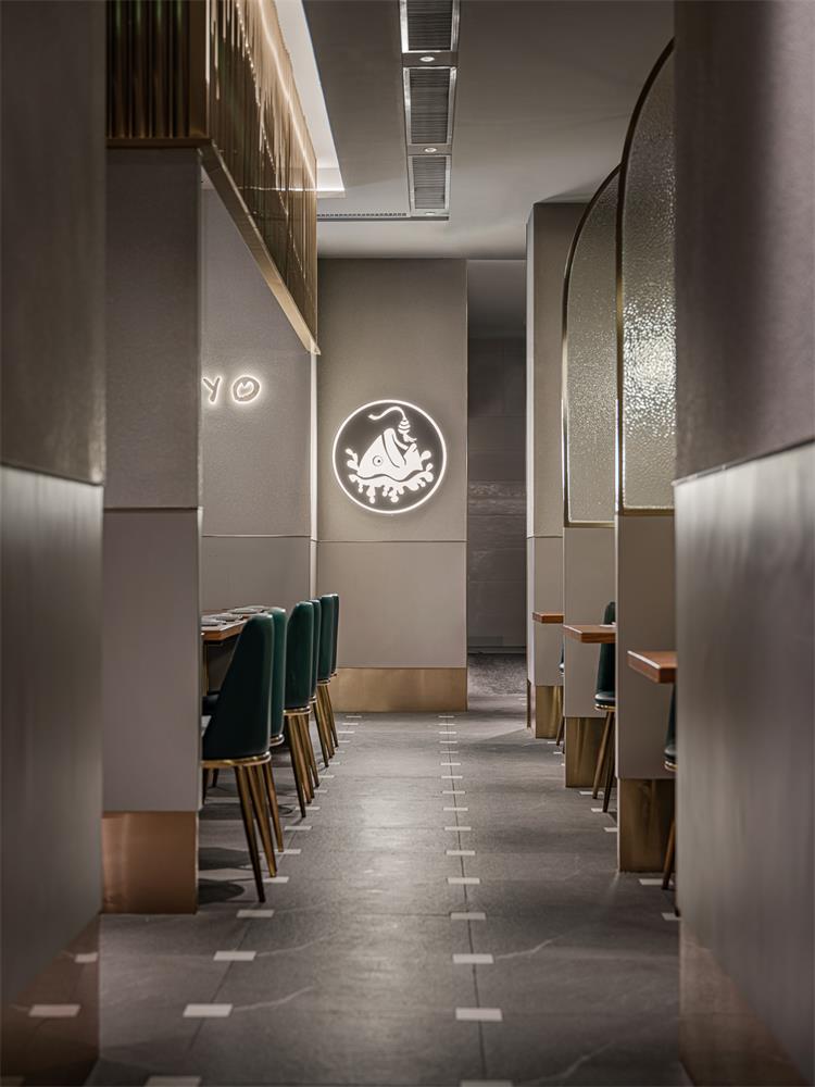 本案大漁從門頭開啟了一次揚帆遠航,船帆造型的陣列和水紋玻璃賦予的海洋寓意,讓空間故事揭開探尋的序幕。在水磨石的自然紋路、和霧雨灰鋼板的內斂、和金色不銹鋼的碰撞中,步入餐廳黑色瓷磚勾畫的海浪中幾只大魚的“魚眼”躍然出現。