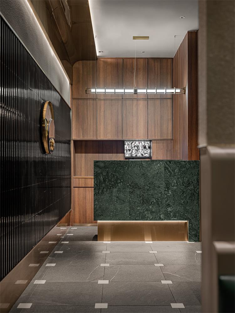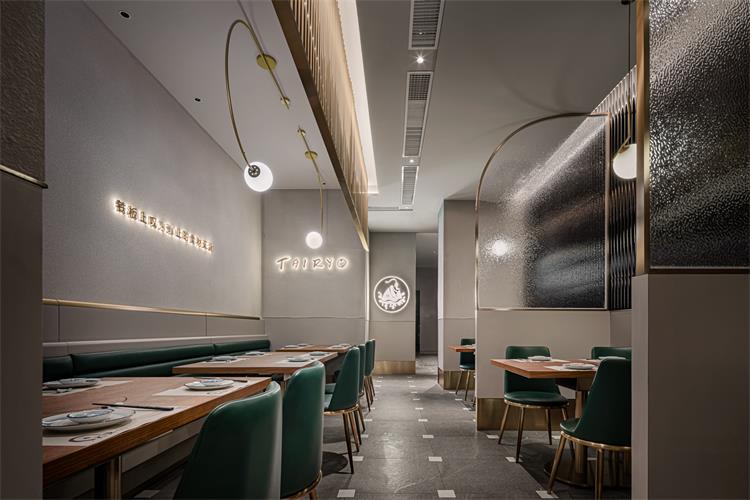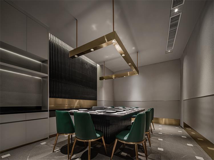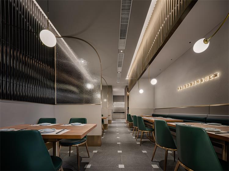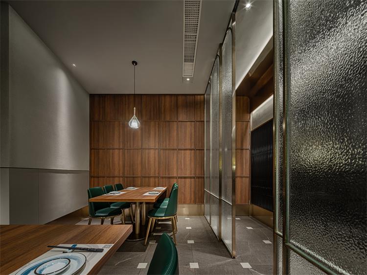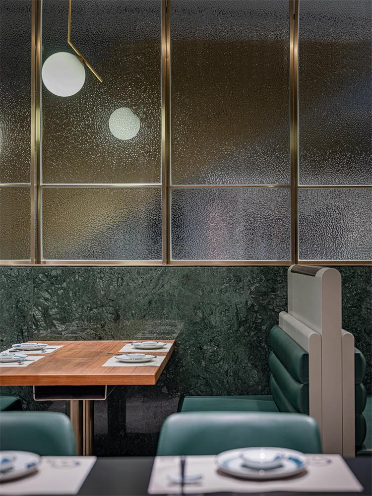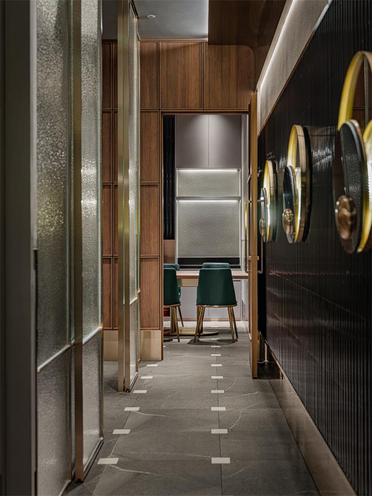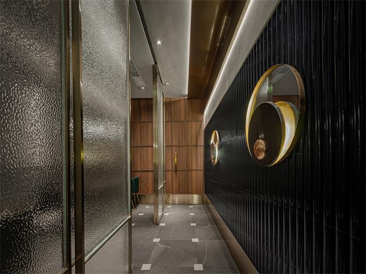 輕奢氛圍營造恰到好處,細節(jié)處也有巧思。如地面,來自東方的榫卯元素融入瓷磚接縫處;立面收納柜有木紋防火板的溫潤自然調劑氛圍,使空間不至于太冷。包間墻面的肌理襯托出大漁logo的低奢貴氣,水紋玻璃和不銹鋼搭配,讓隔斷在劃分空間布局的同時,又互有趣味連通。大漁除了精準的輕奢氣質拿捏,無處不在的海浪弧形元素也賦予空間統(tǒng)一性。