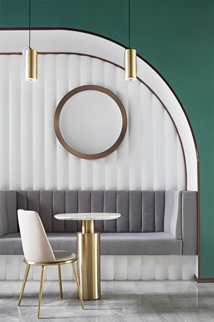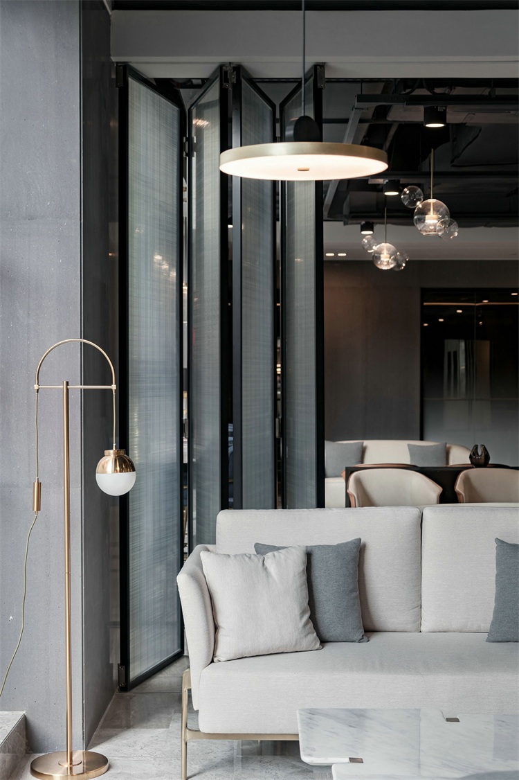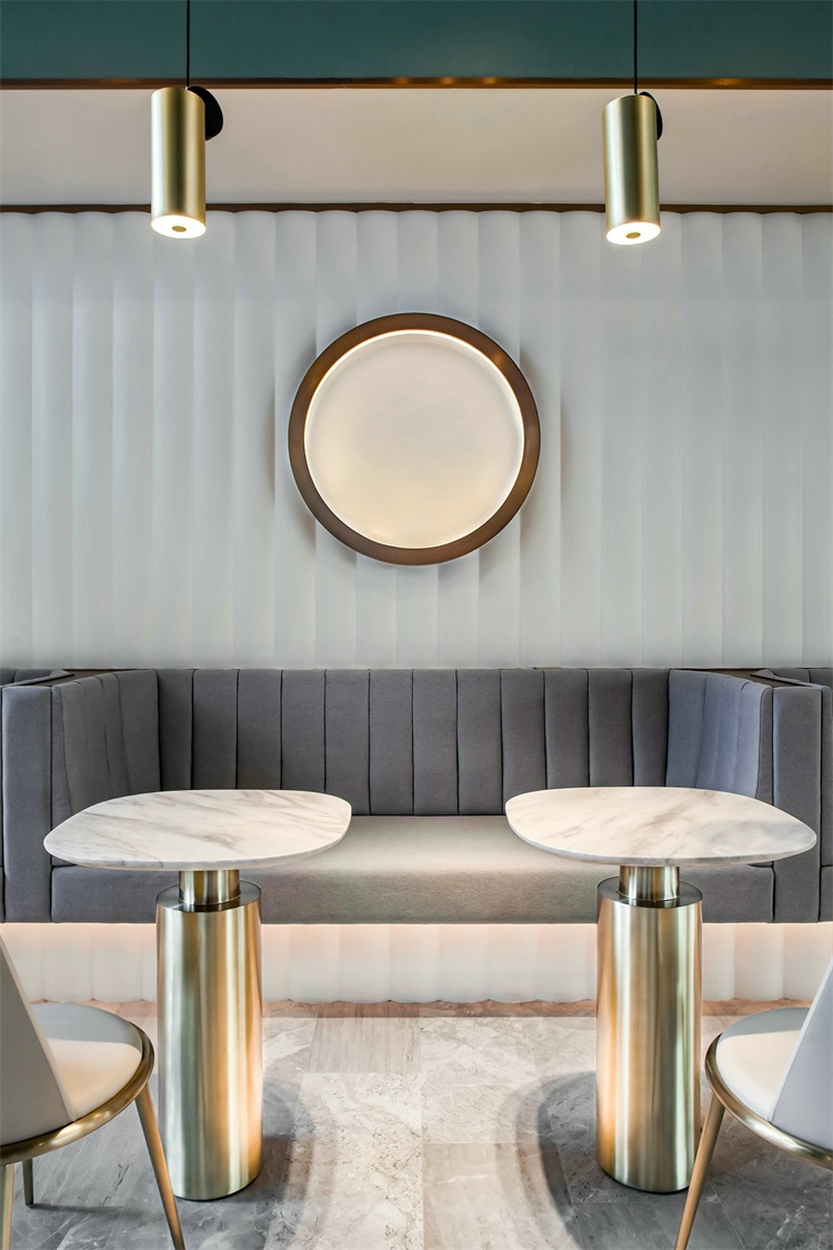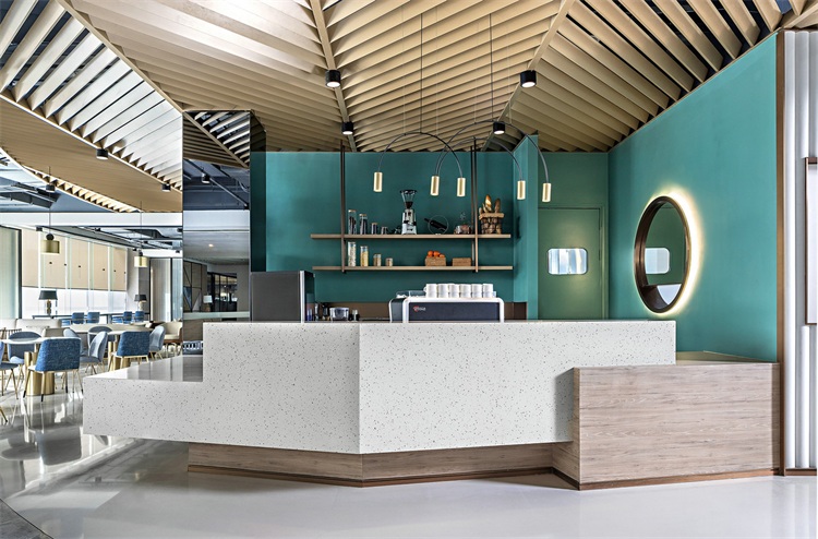 Yanlord Home咖啡廳是一個可容納約60人的休閑空間。設計師以自然感的孔雀綠為主調,配備滿足各種功能需求的家具組合,包括三人卡座、四人洽談沙發、景觀吧臺吧椅。布局上考慮到空間的變動性,設置可開合式玻璃折疊隔斷,使咖啡廳成為可聯誼聚會的多功能可變交流場所。