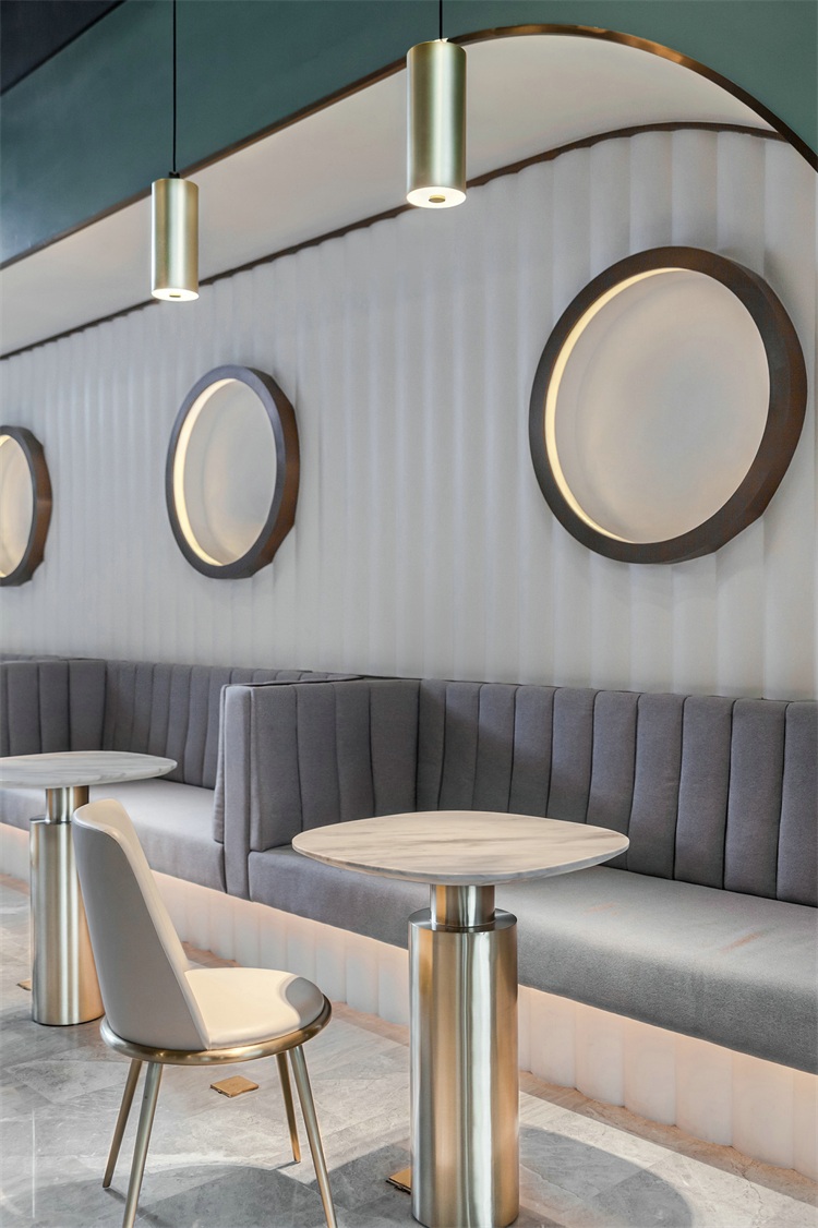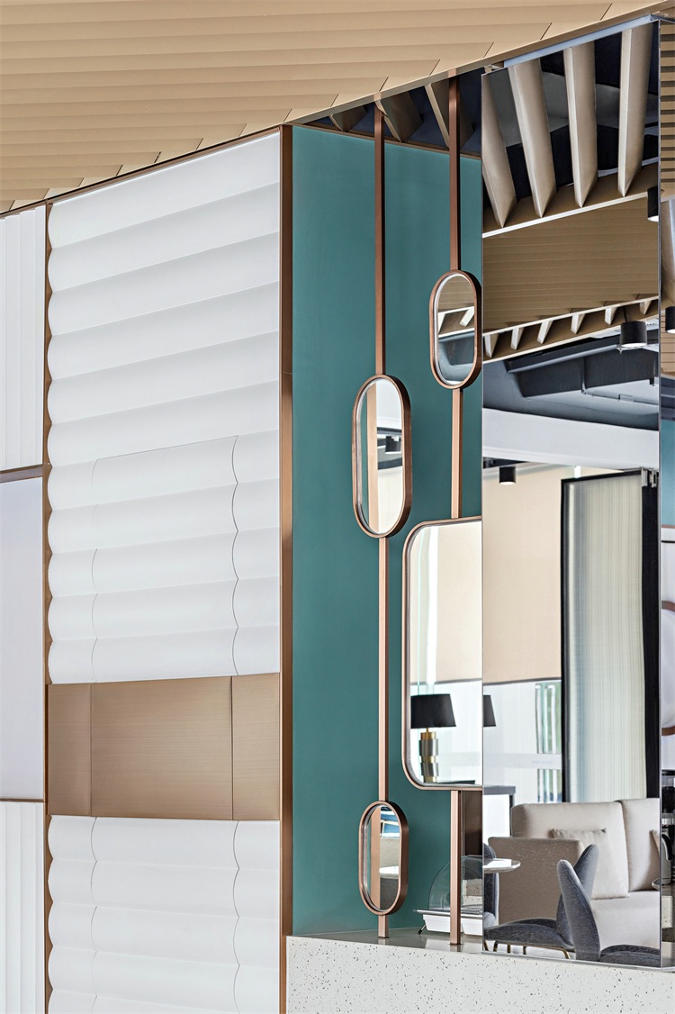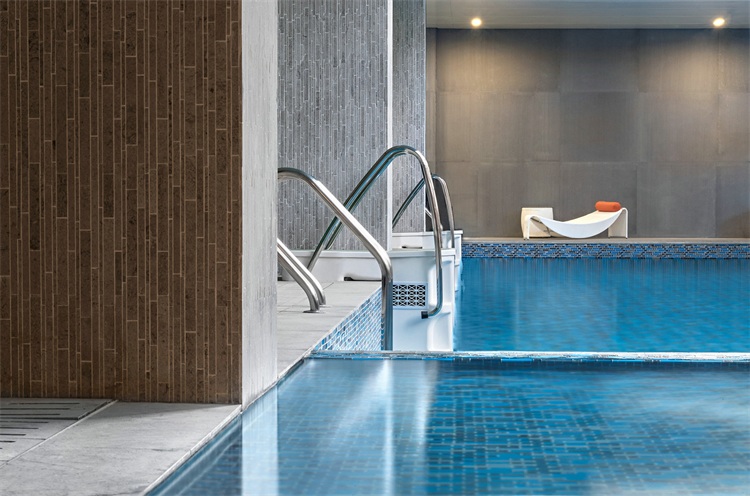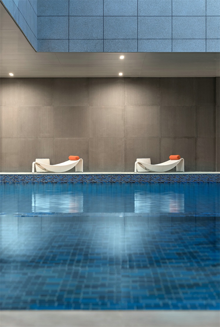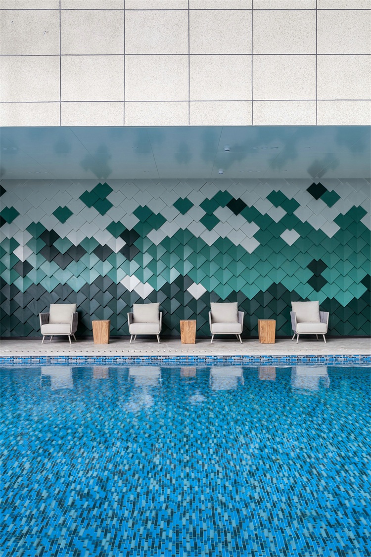 會所內并設置多樣配套空間:如多功能廚房及娛樂房,提供小型派對或廚藝體驗班。休閑咖啡區旁附設戶外露天泳池,幾何立體造型墻抽象地表現山勢之美,色調上同樣采用孔雀綠,漸變出頗具意味的幾何畫像。駐足于此,人們油然而生藝術思考之感,在城市繁忙節奏之外尋獲生活的平衡。