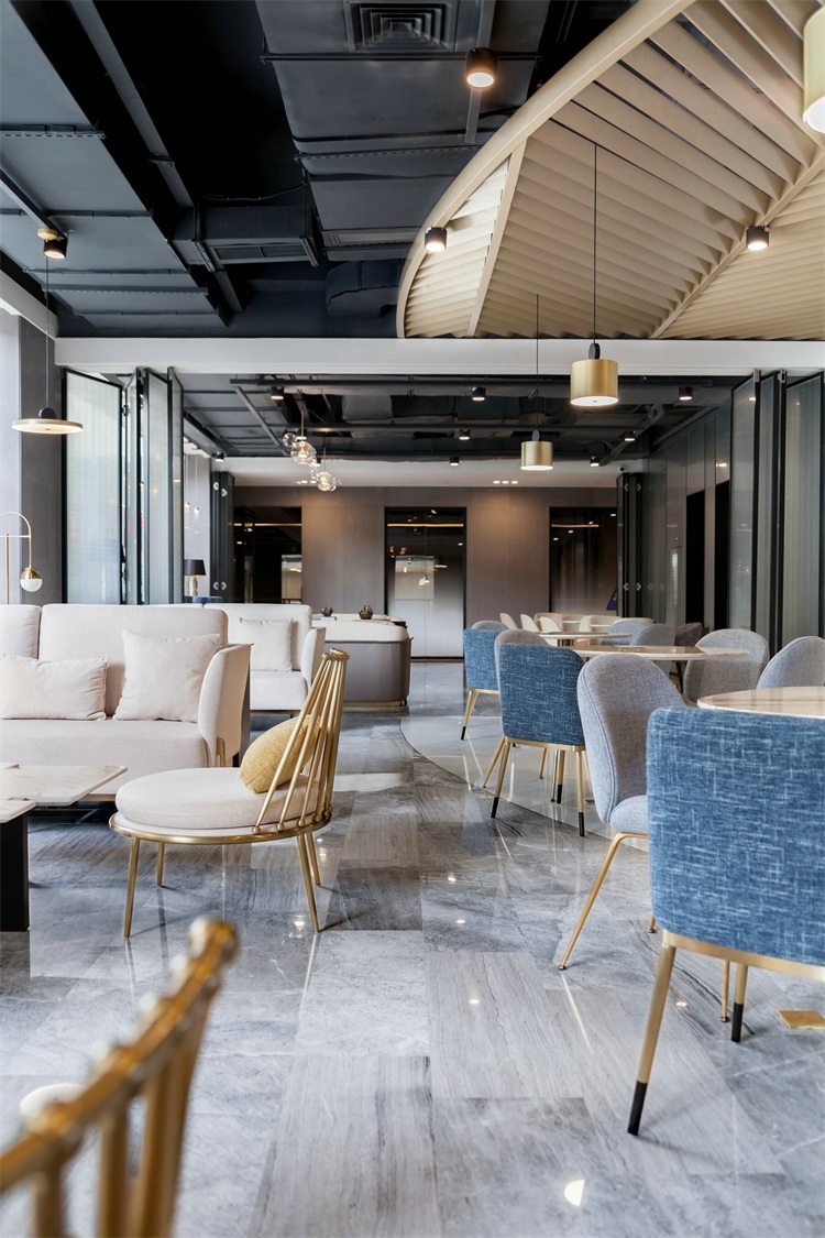深圳 : 依山傍海的國際化都市,設計師將該市之自然與人文印象提煉為設計元素并融入整體空間。從服務吧臺造型由不同的盒子迭加,至鋁條吊頂亦縱橫亦傾斜的非常規排列,呼應地面半圓形的水磨石區域,抽象且具體地表現出高低錯落、路線連網的城市印象。