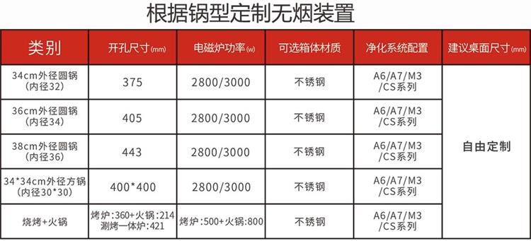 可定制范圍:智能化觸屏板、配套火鍋電磁爐、油煙凈化裝置、抽風組件、全不銹鋼箱體、USB充電插座、配套鍋型和鍋圈、火鍋臺面、框架、無線充電等等。