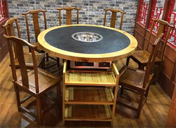 橡木邊框鑲嵌天然火燒石無煙圓形火鍋桌
